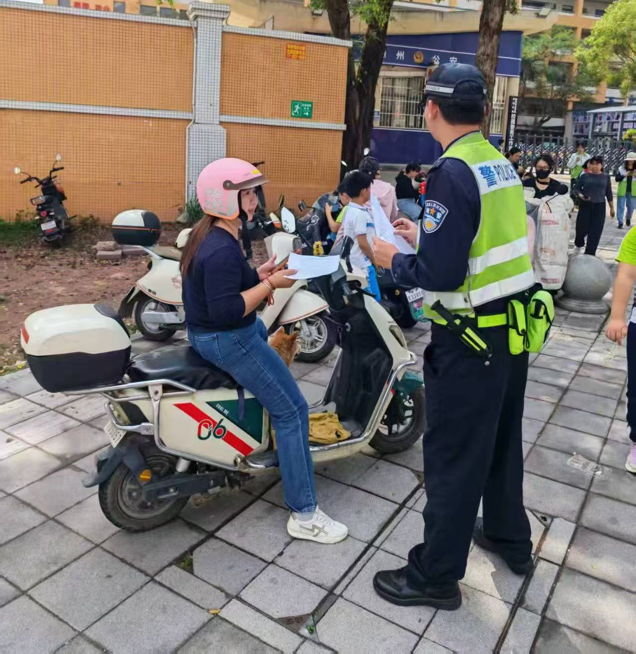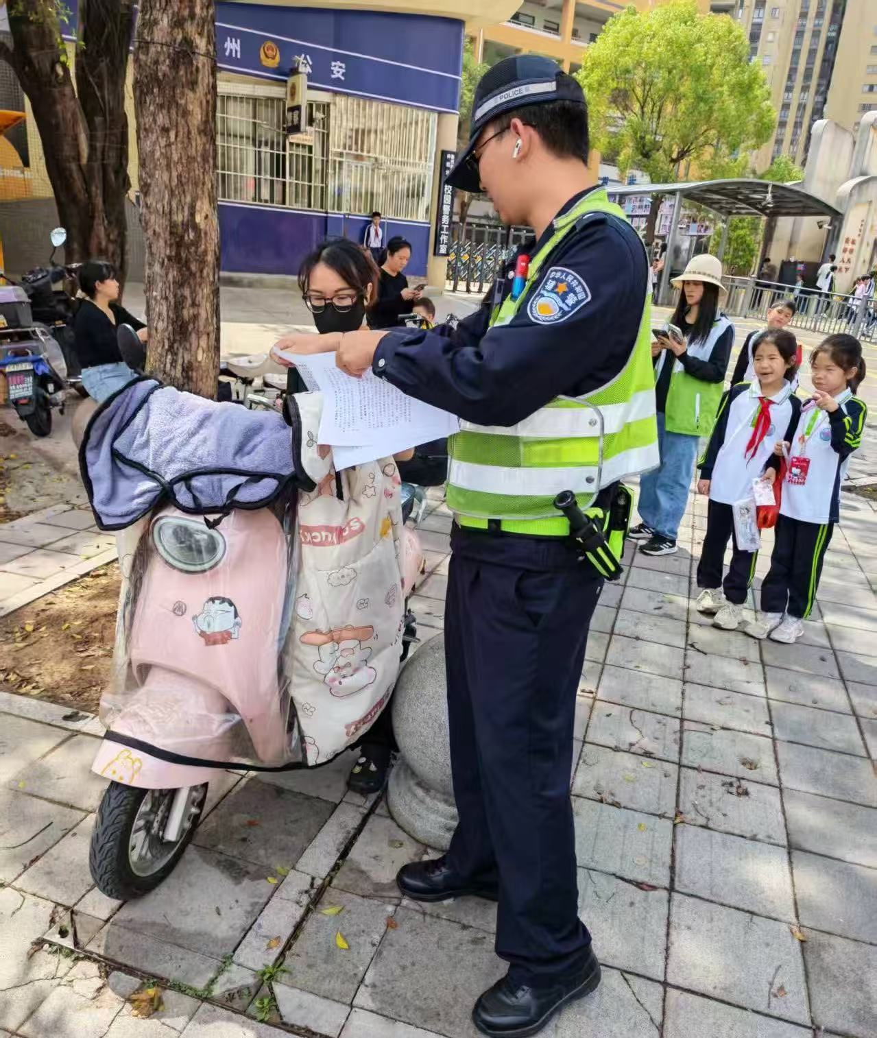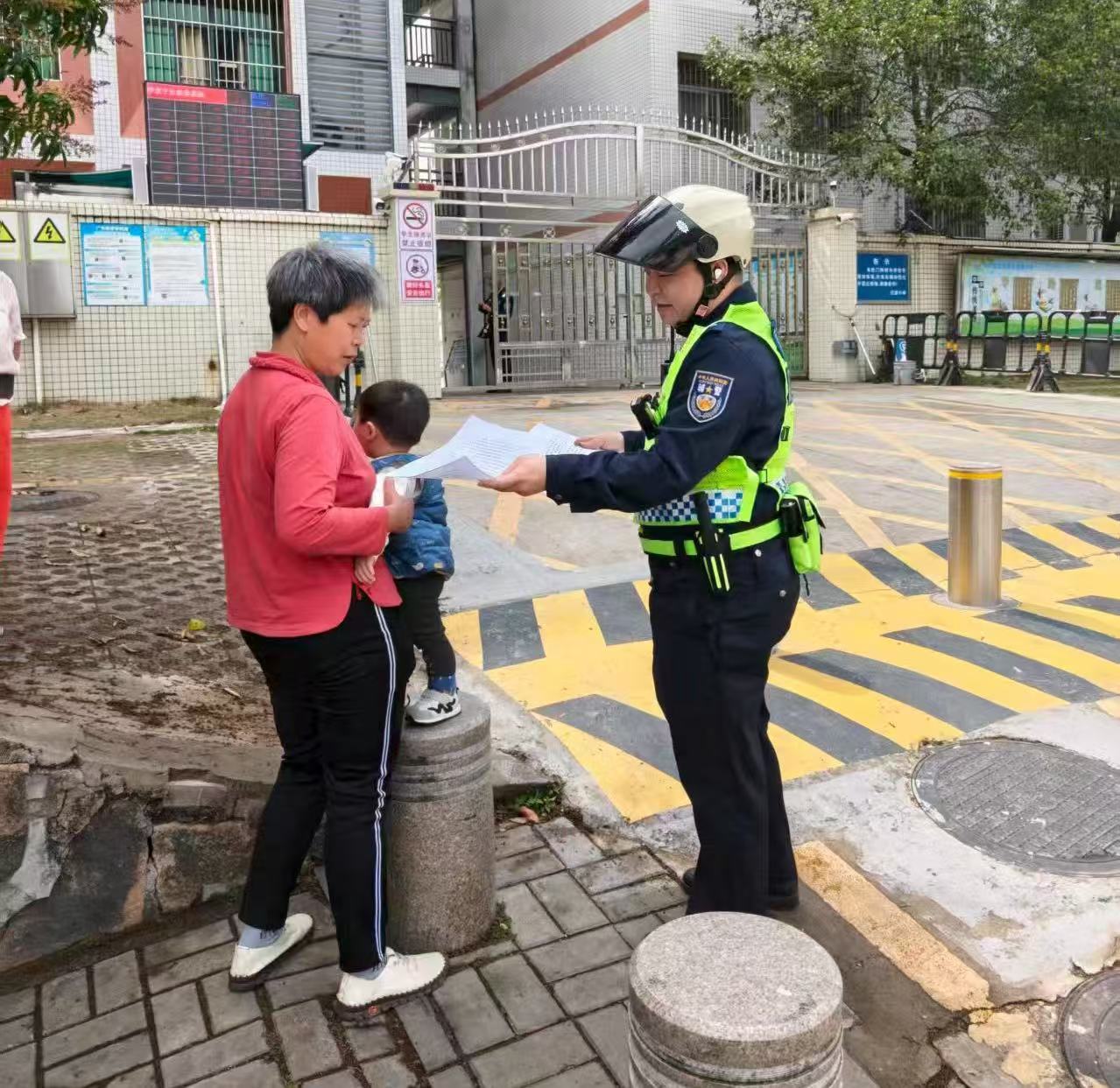 当日7时许,执勤民警已准时到岗,在学校门口及周边重点路段设置执勤点,指挥疏导交通,引导接送车辆即停即走,保障开学首日道路畅通有序。在守护学生安全出行的同时,执勤民警积极把握“护学”契机,持续开展交通安全宣传教育活动,利用校门口广播循环播放交通安全提示音频,并向接送学生的家长现场派发《安全“马”上出发!惠州交警致全市学生及家长的开学一封信》交通安全宣传资料。